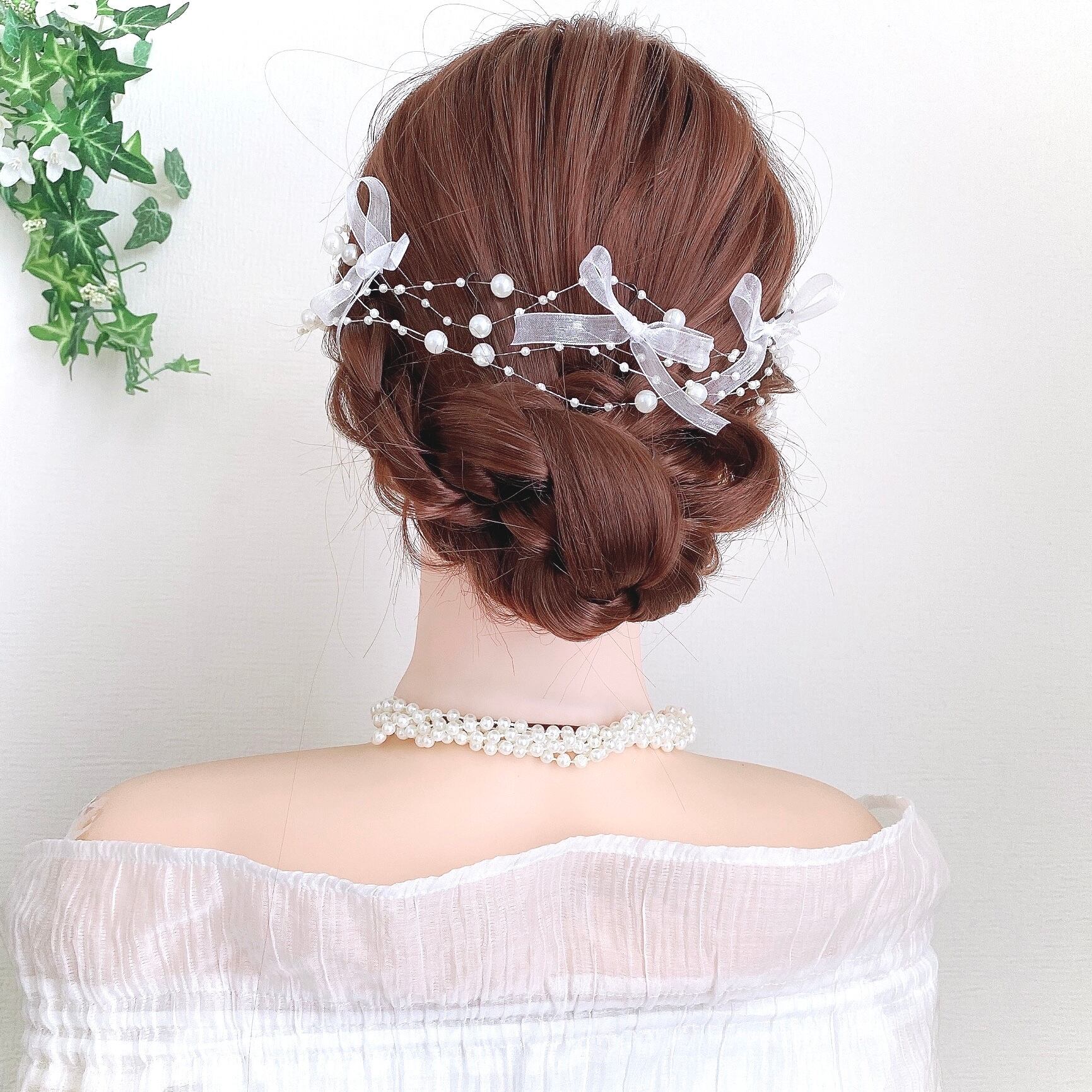小さなリボンとパールが連なった華やかなバックカチューシャ