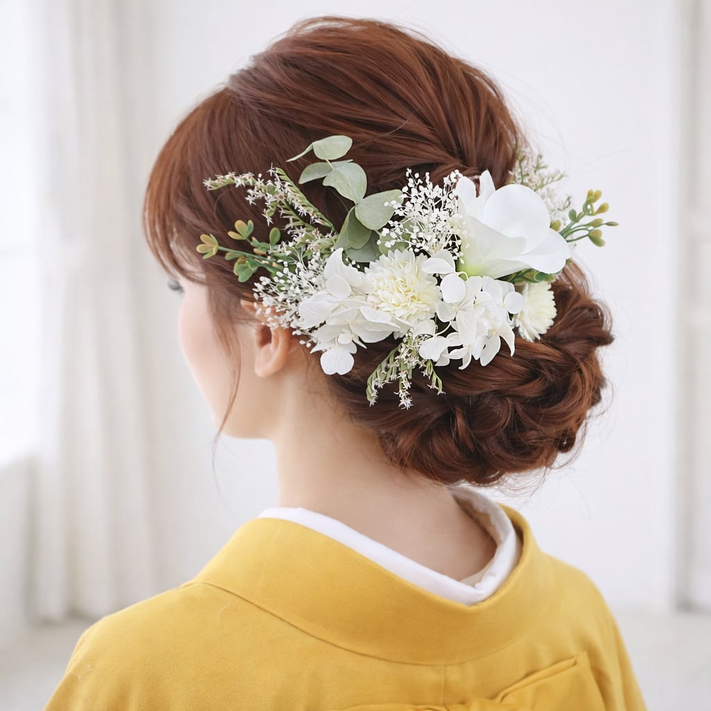 アーティフィシャルフラワーは写真写りもよく、劣化しないため、成人式、前撮り、お式本番、浴衣、結婚式の参列など 繰り返しお使いいただけます。