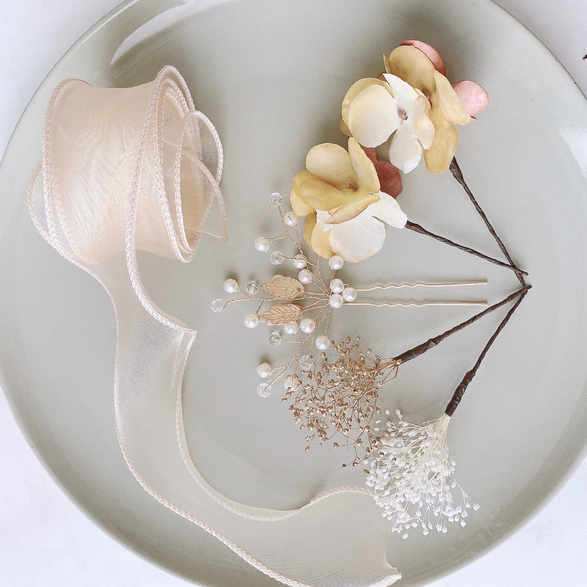 洋装・和装どちらにも合う お花とシアーリボン、パールの小枝ピンのヘッドドレス