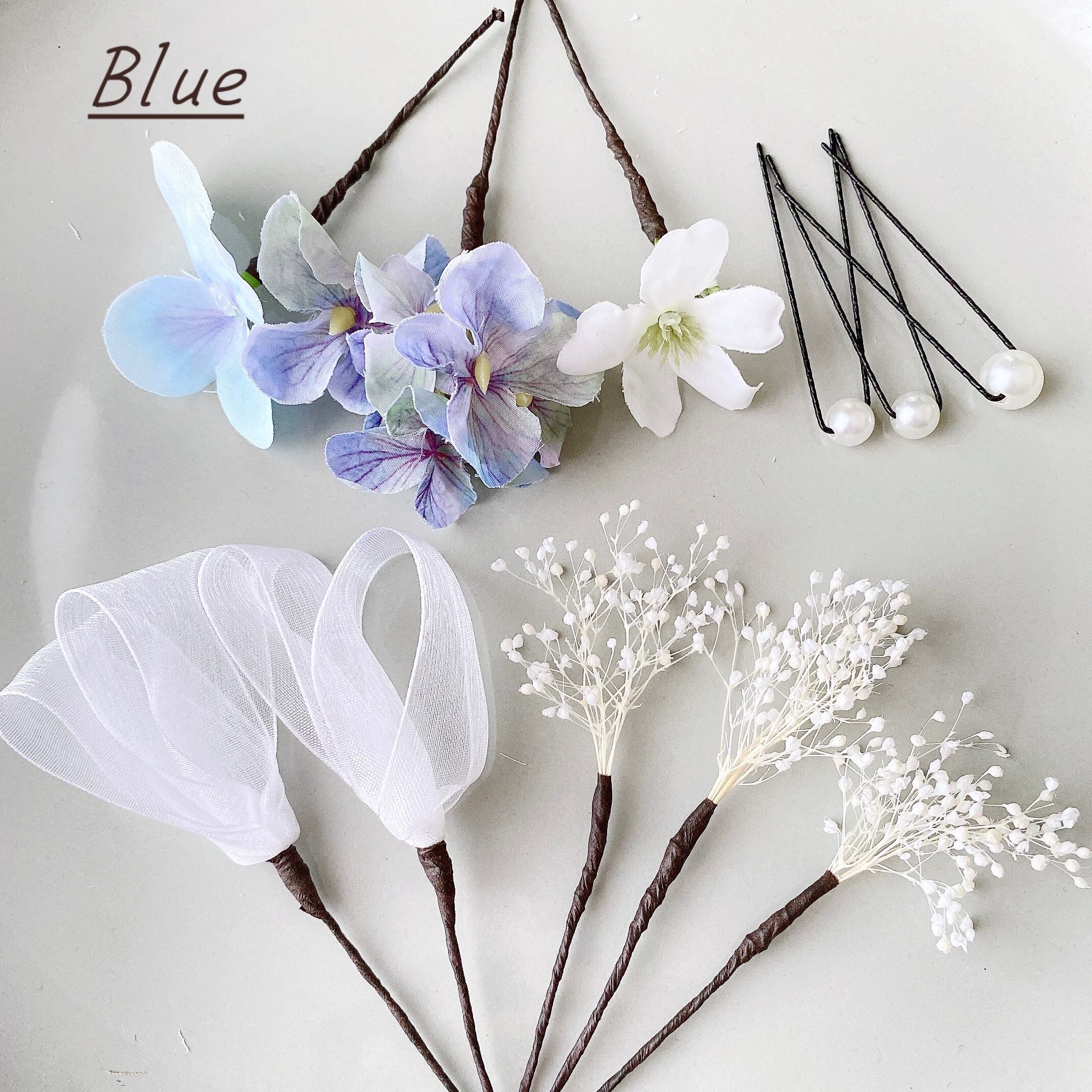 チュールリボン、パール、紫陽花やかすみ草などの小花のヘアピン 9点セット
