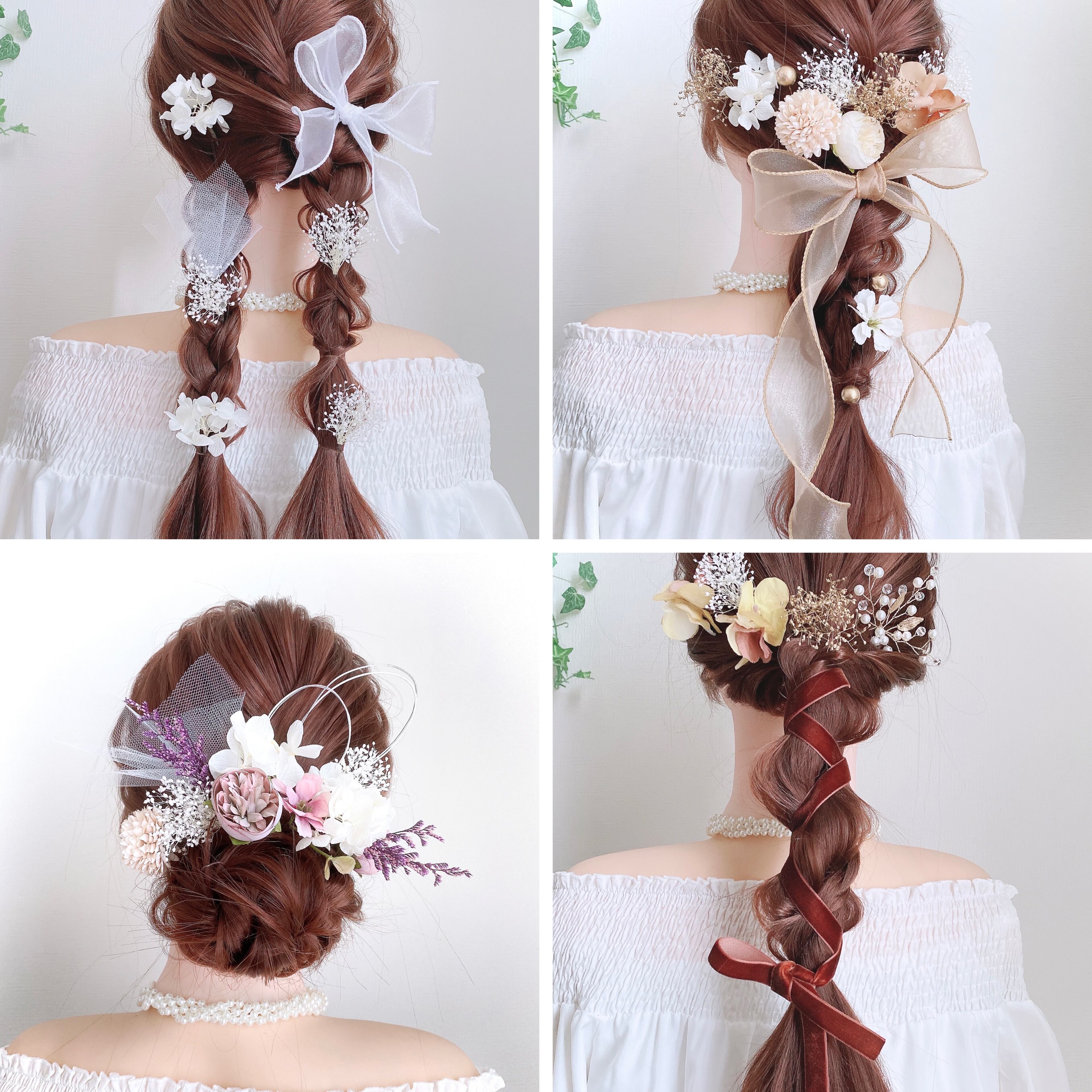 まとめてつけても、左右に分けたり、編みおろしなど全体に散らしてつけても可愛いです