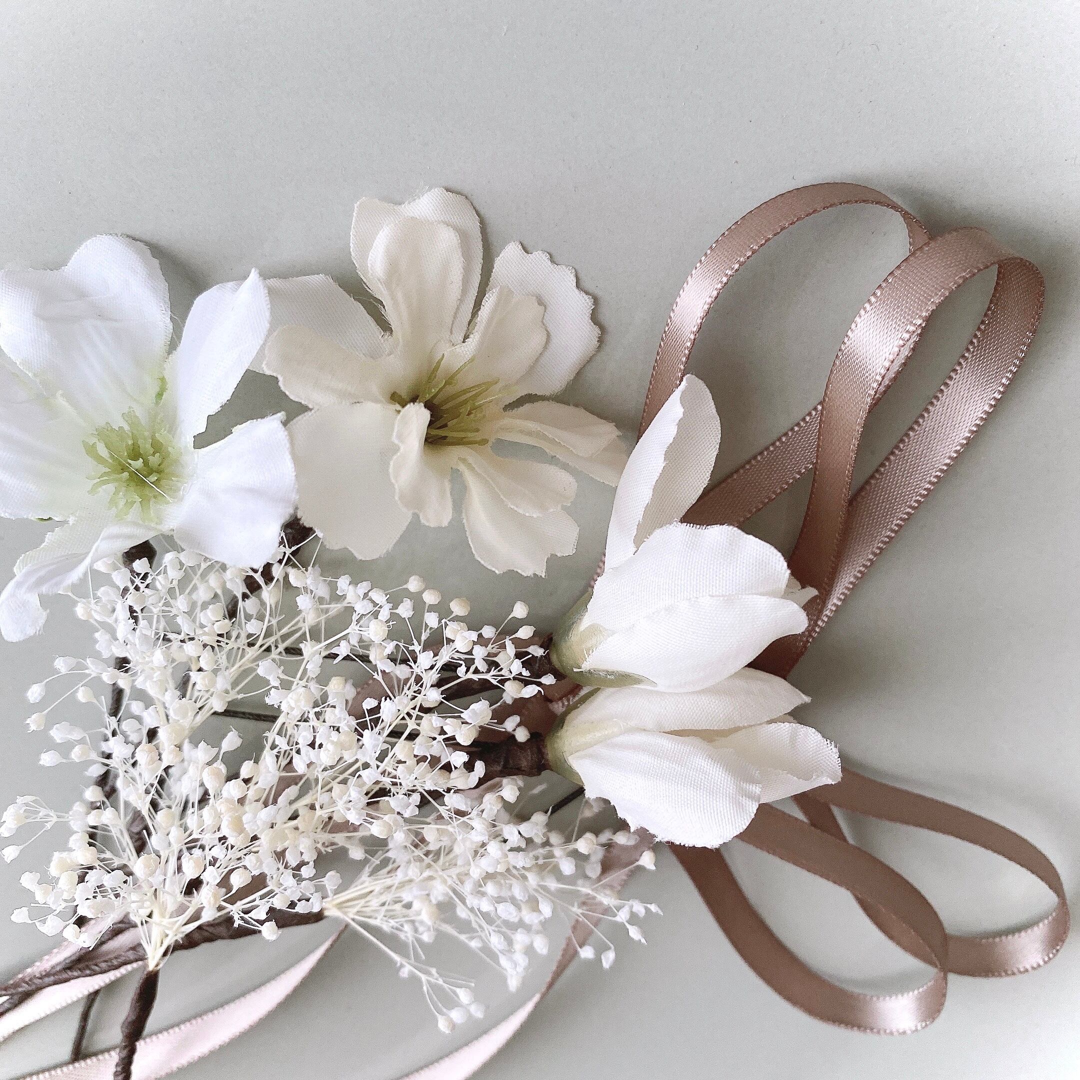 白の小花(かすみ草はプリザーブドフラワー)のヘアピンと、モカベージュのサテンリボンUピン2点のセット