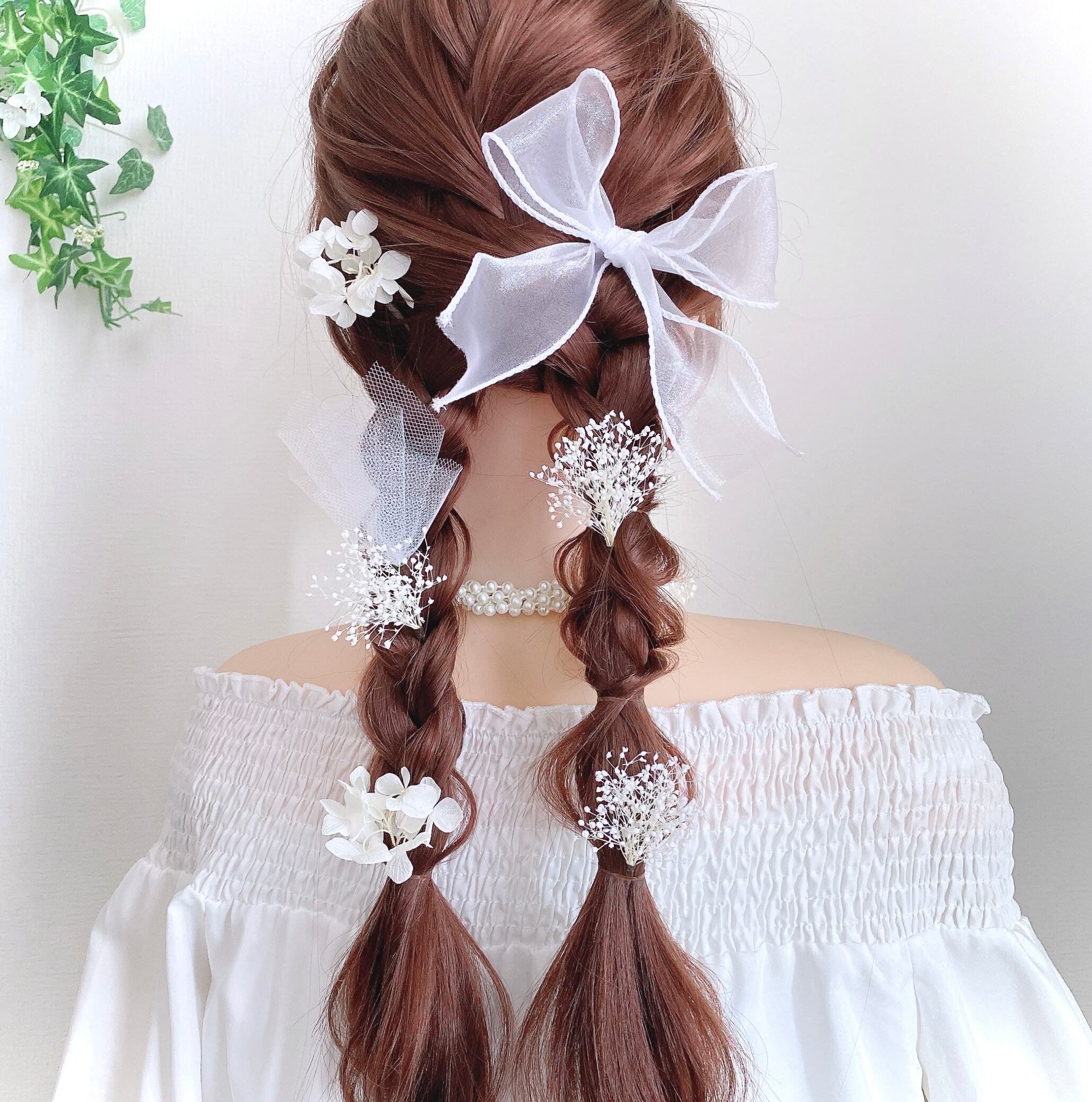 まとめてつけても、左右に分けたり、編みおろしなど全体に散らしてつけても可愛いです。