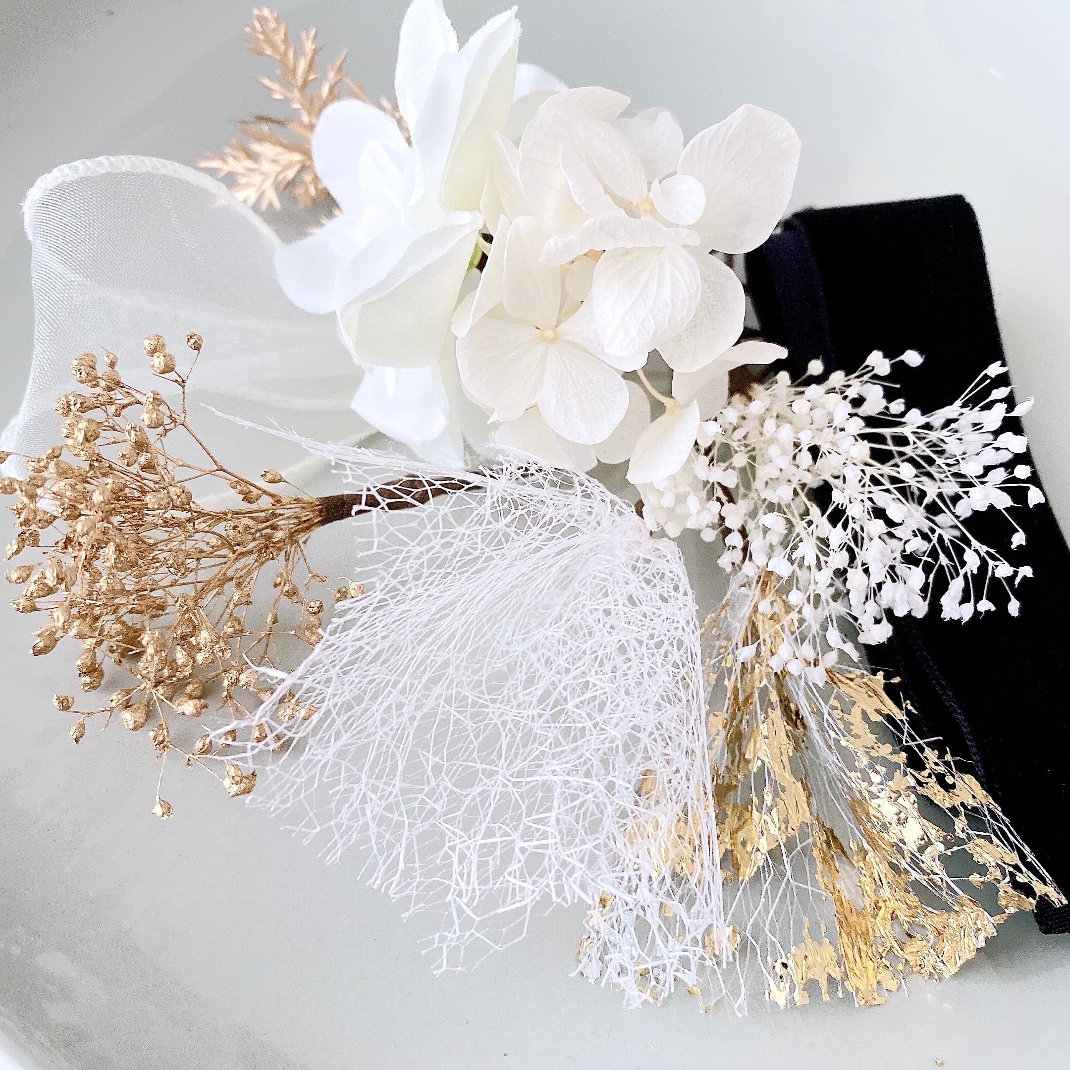 紫陽花とかすみ草(プリザーブドフラワー)、ホワイト系のフラワーピン、チュールピン、黒のベロアリボンのセット