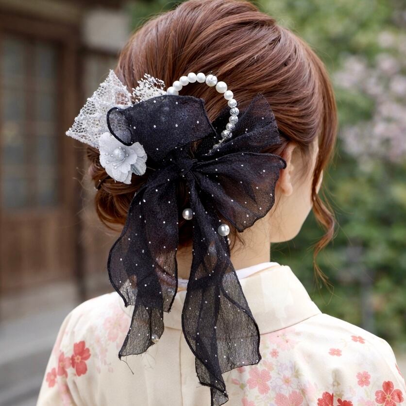 黒 ヘアリボン シルバー ㉛ 髪飾り 結婚式 卒業式 フラワー ヘアピン ドット柄 ヘアアクセサリー ヘッドドレス