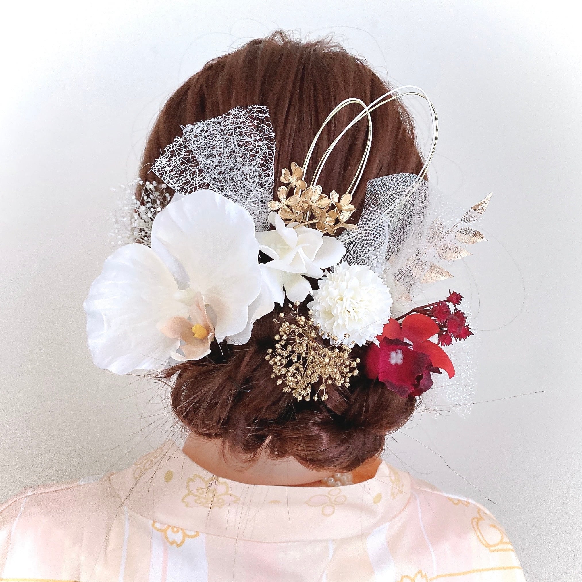 胡蝶蘭 ベージュ 赤 ゴールド 花 ㉟ ヘアアクセサリー 結婚式 成人式 卒業式 ㉟ 髪飾り 振袖 袴 和装 花嫁 ブライダル