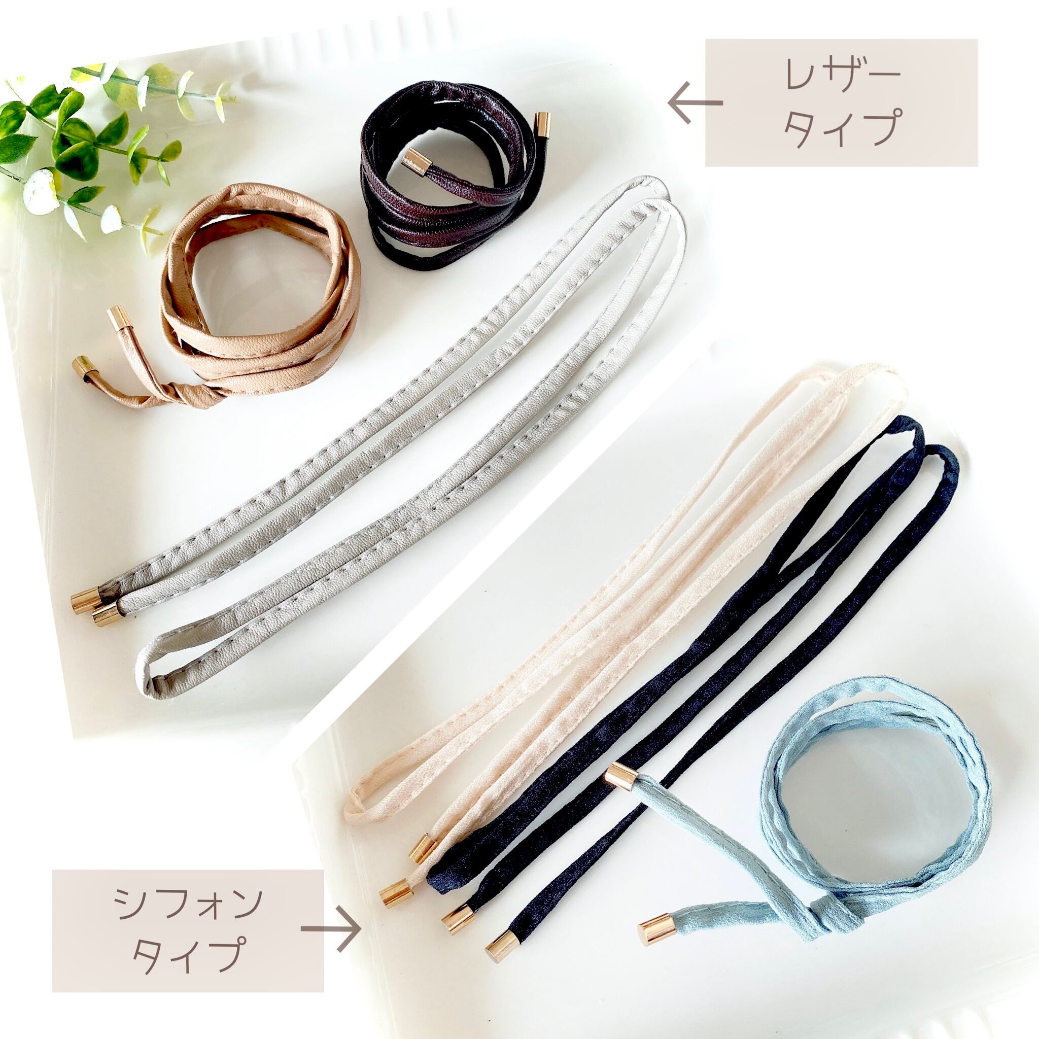 どんなスタイリングにも馴染むしなやかなエコレザータイプABと、程よいカジュアルさが魅力のシフォンタイプCDEがございます。