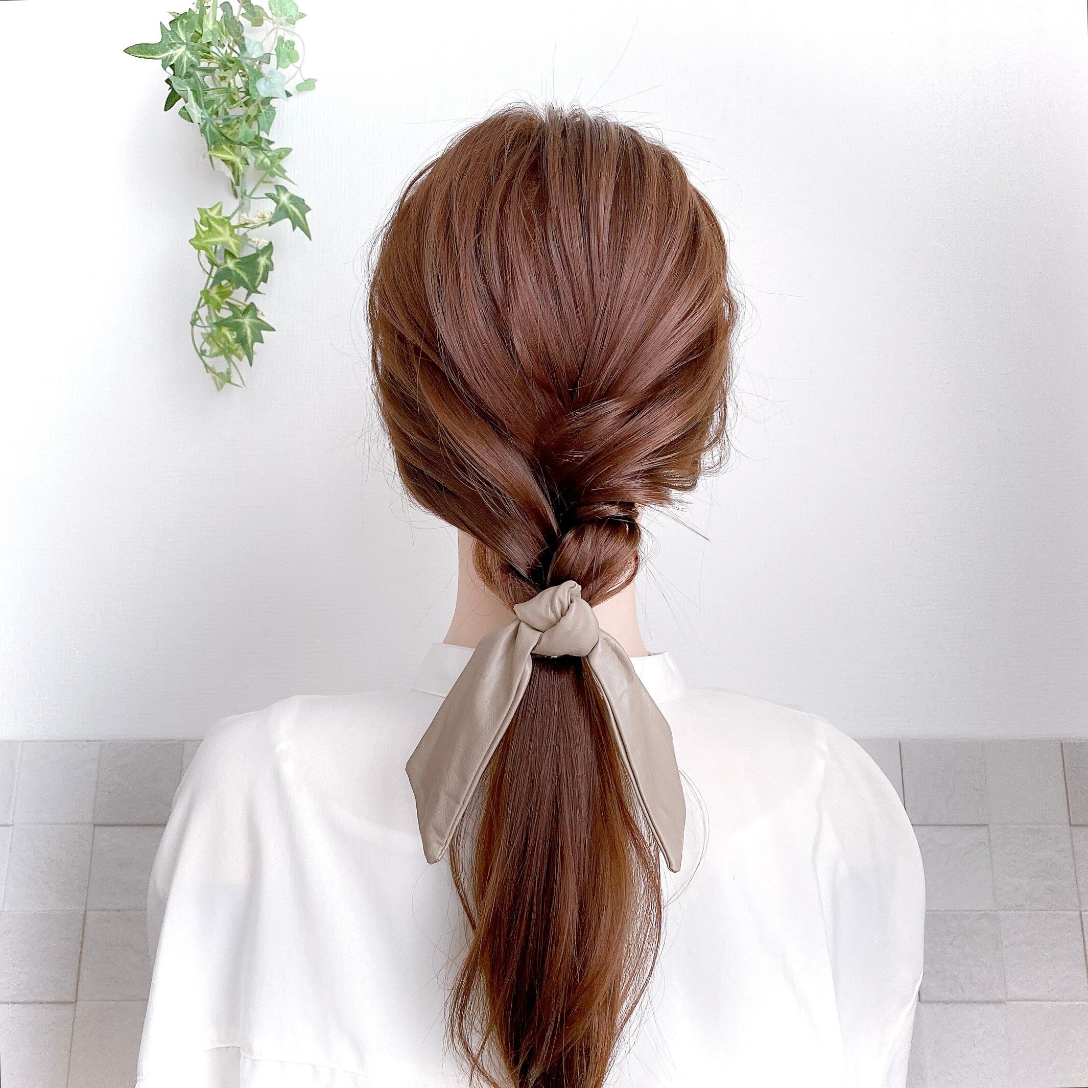 縛ったゴムを隠すように巻きつけ、1回ねじるとリボン型にもなります。