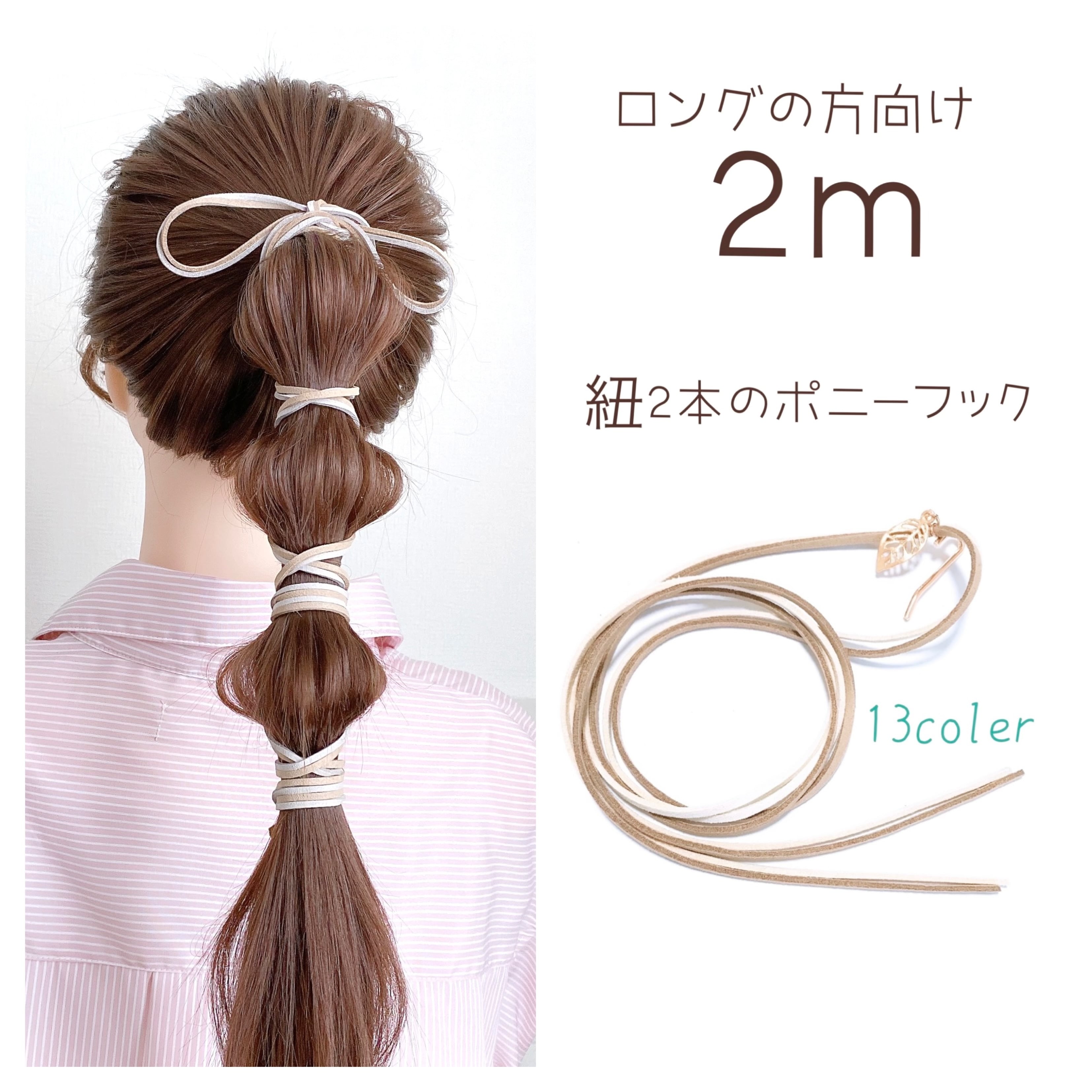 紐は2メートル前後あり、ロングの方も下まで巻いたり、ゴムに重ねてリボン結びをしたり、三つ編みの上に巻いたりと、色々な紐アレンジが楽しめます♫