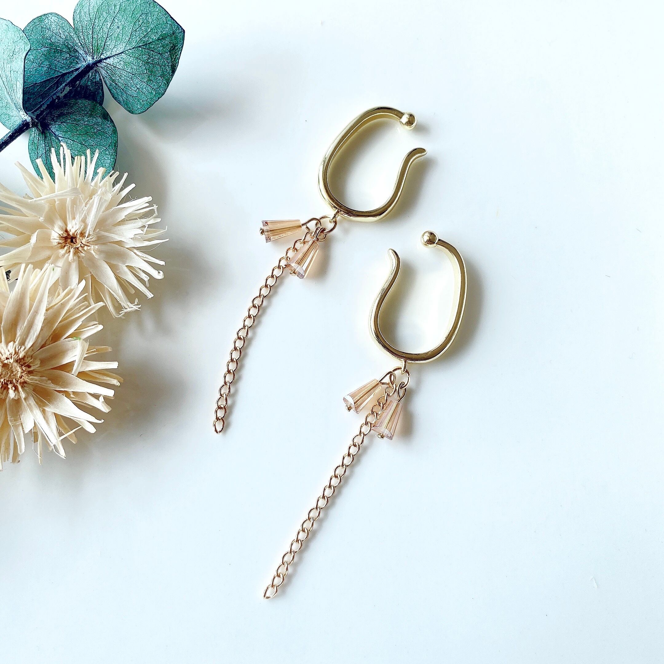 【シャンパン】揺れる ガラスチャームのイヤーカフ 片耳 両耳