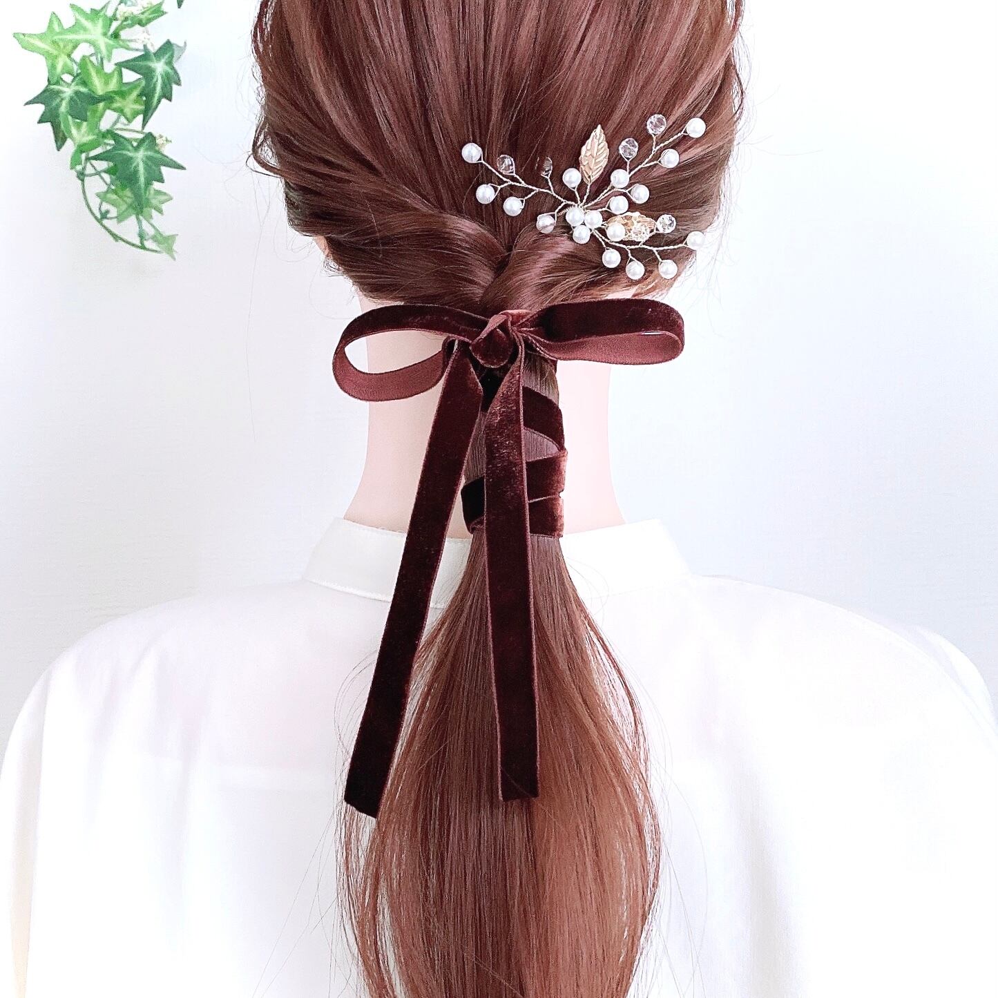 【ダークブラウン】ベロアリボン ベルベットリボン 結婚式 お呼ばれ ヘアリボン ポニーフック