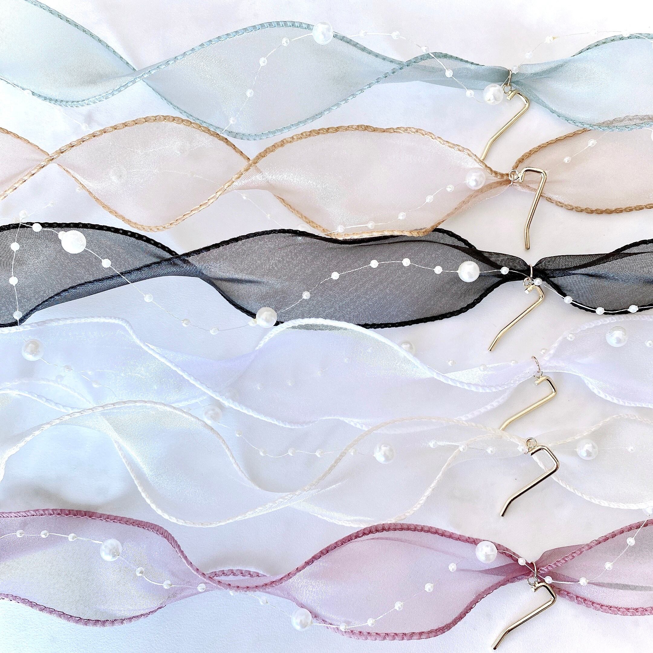 柔らかなウエーブのあるシアーリボンと、パール付きテクスコードの真ん中に、1つのフック金具がつています。