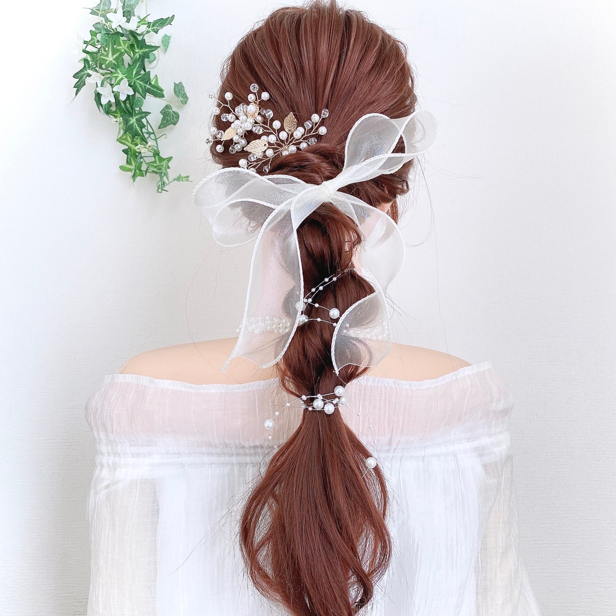 オーガンジーリボン シアーリボン パールアクセサリー 紐 ヘアアレンジ ぐるぐる タイトポニー ヘアアクセサリー りぼん 巻 シンプル リボン マジェステ こなれ ポニーフック ヘアフック ヘアカフス ヘアゴム 大人っぽい おしゃれ 巻き付け 簡単アレンジ カジュアル 編みおろし ブライダル ウェディング フォーマル 結婚 卒業 入学パール 白