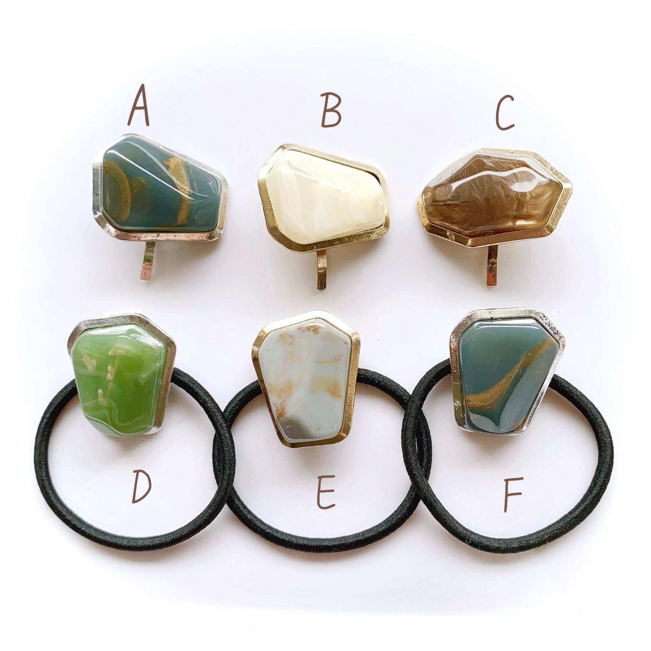 天然石のようなマーブル模様がポイントになった多角形のポニーフックやヘアゴムです。