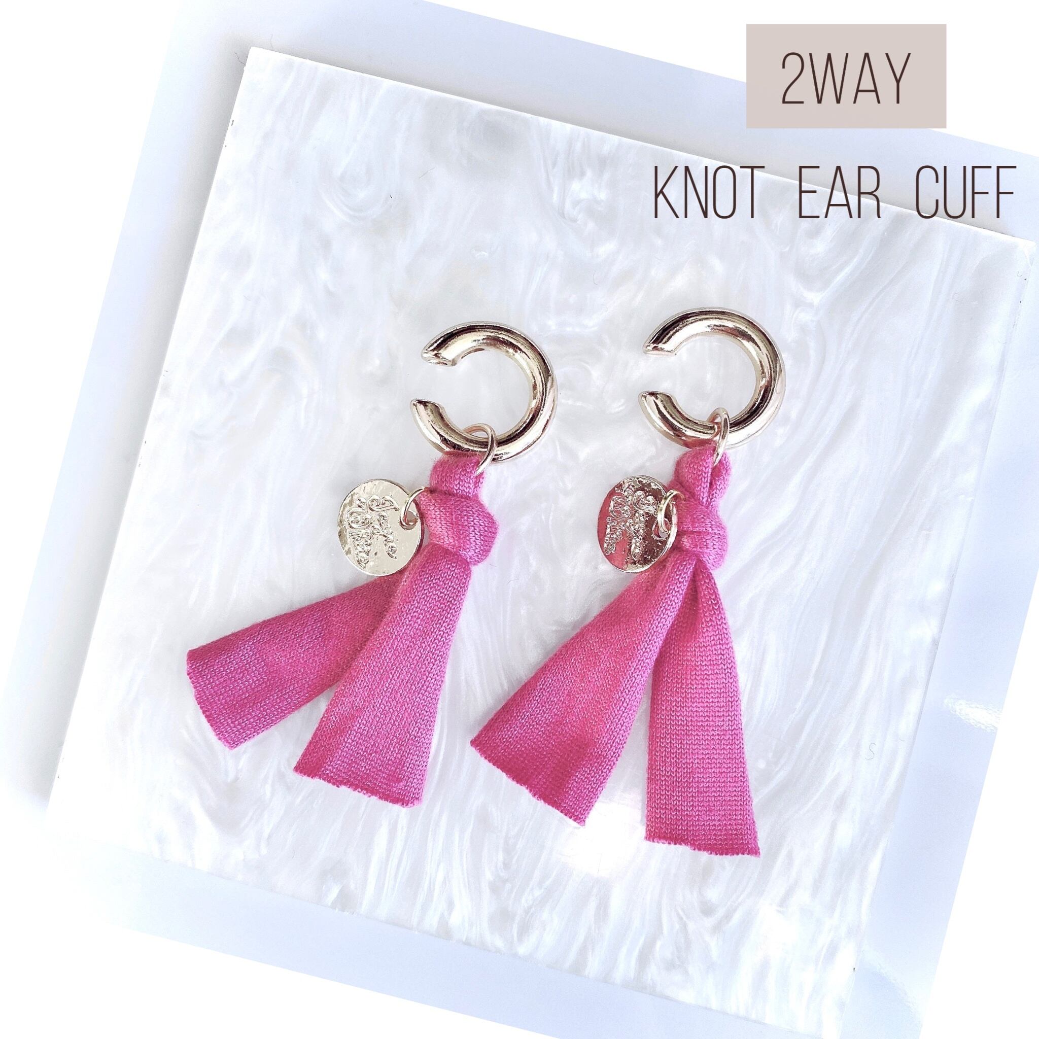 2WAY ピンク 結び目 イヤーカフ / 片耳 両耳 ヤーン イヤカフ