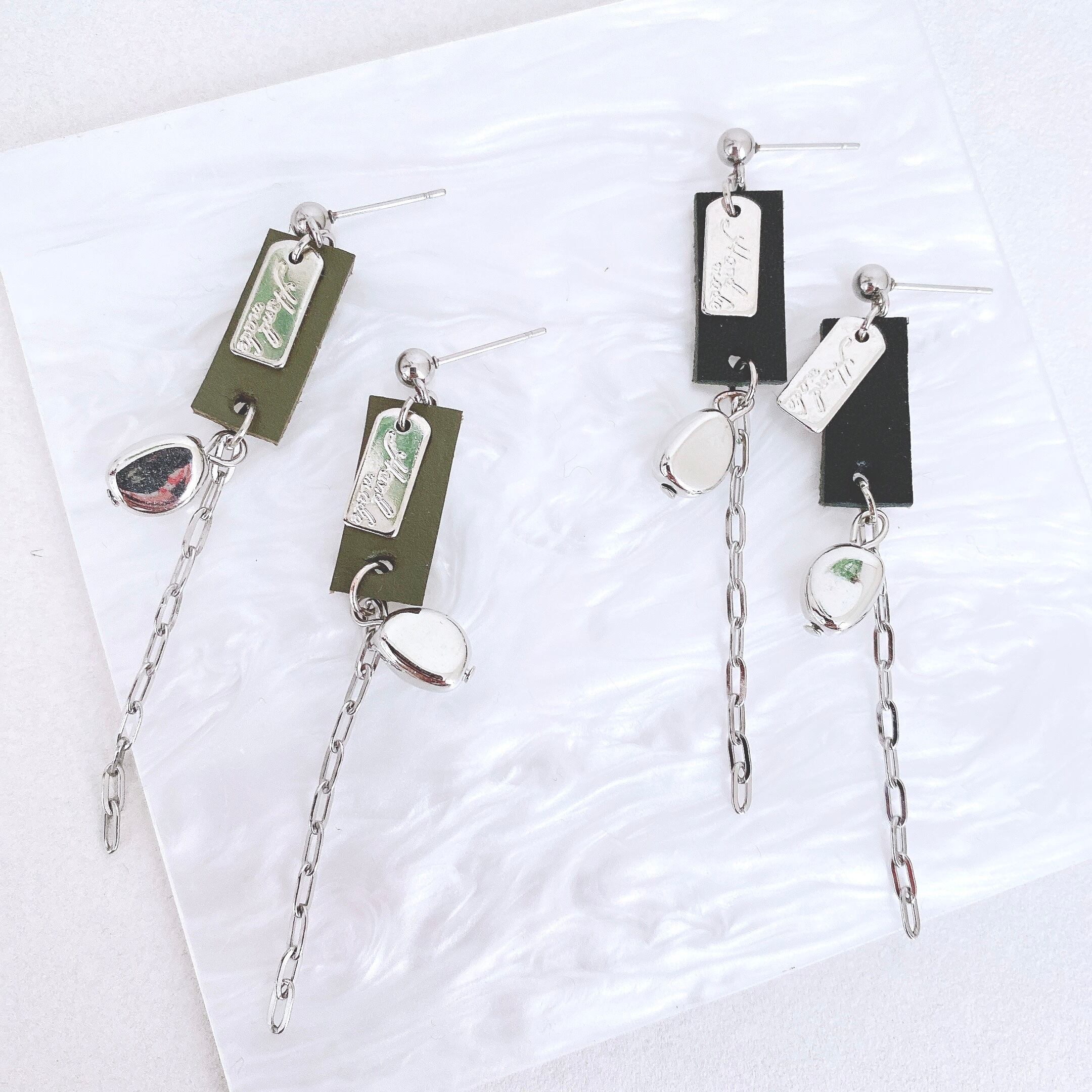 レザー シルバーチェーン ピアス / イヤリング /イヤーカフ 黒 カーキ