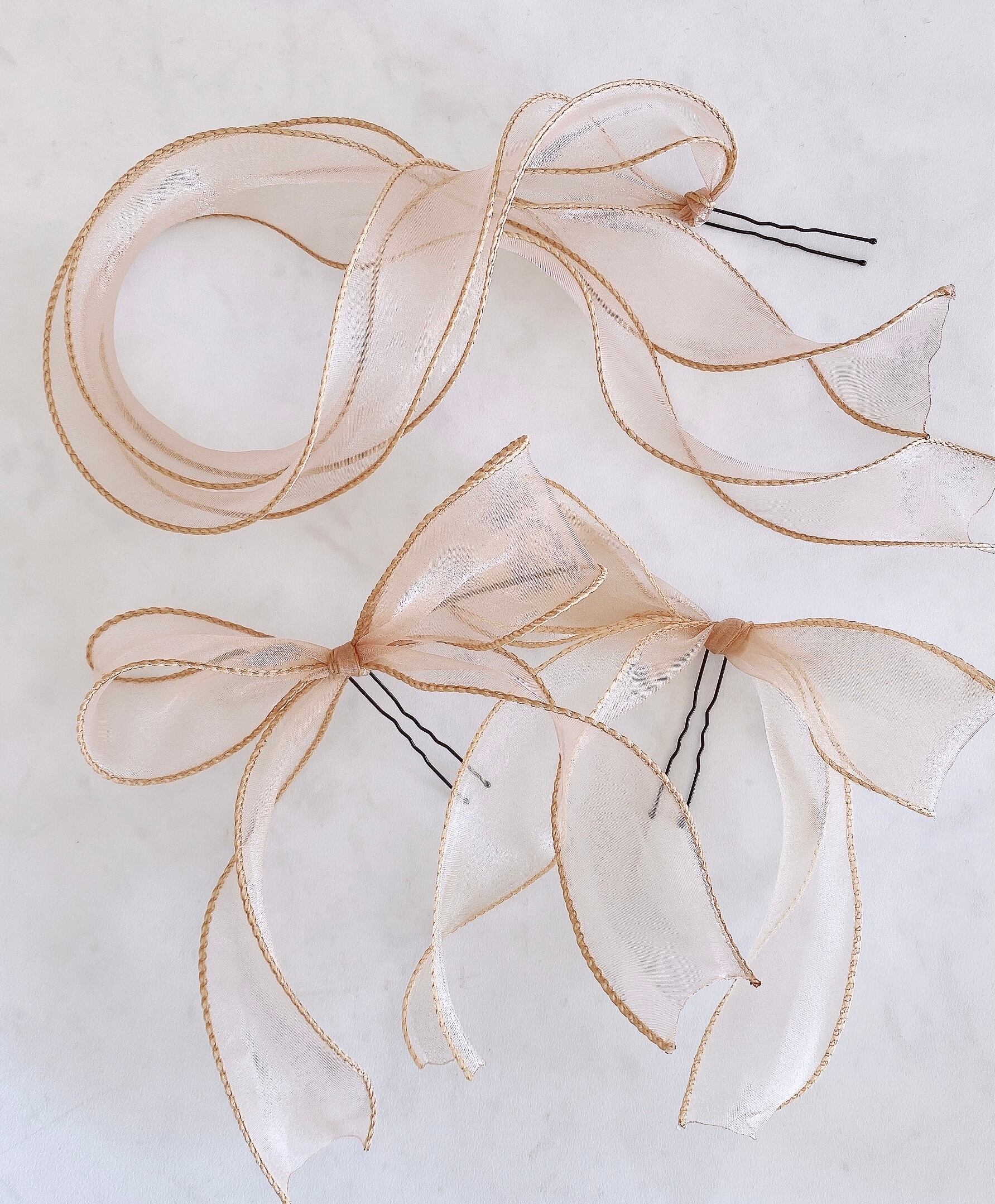 【オレンジブラウン】3点セット シアーリボン Uピン オーガンジーリボン ベッドドレス ブライダルヘア 卒業式ヘア